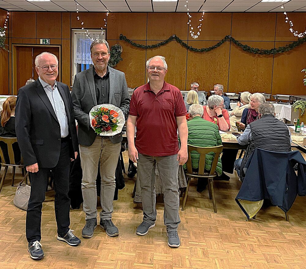 Bildunterschrift: Dr. Thomas Beneke (re.) und Manfred Kallenbach gratulieren Rüdiger Germeroth mit einem Blumenstrauß.