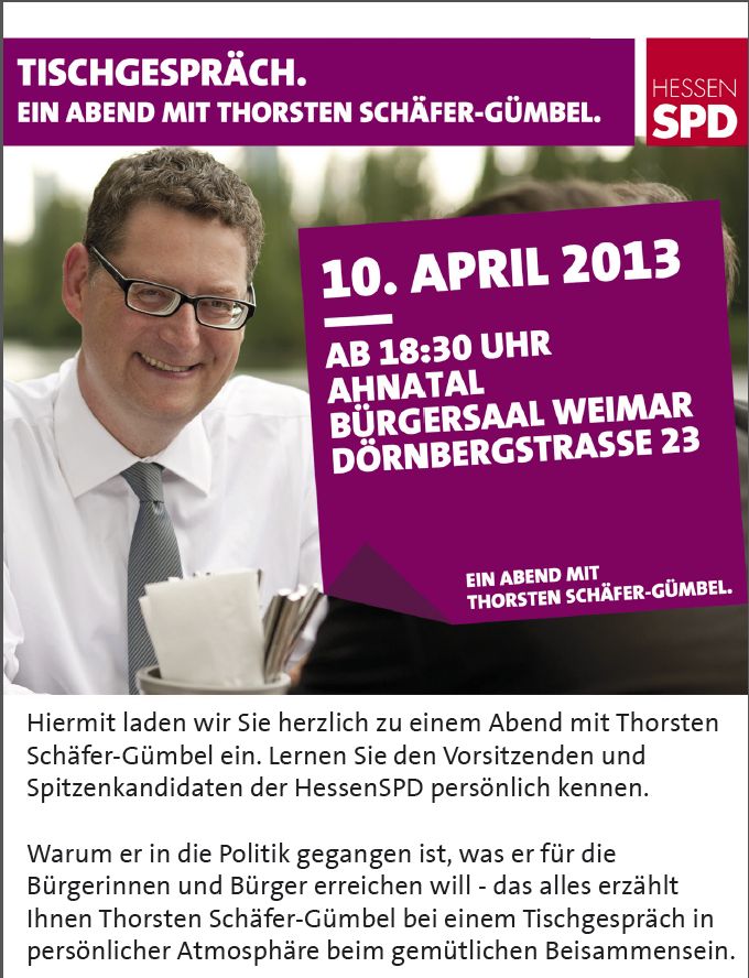 TISCHGESPRÄCH - EIN ABEND MIT THORSTEN SCHÄFER-GÜMBEL. EINLADUNG Hiermit laden wir Sie herzlich zu einem Abend mit Thorsten Schäfer-Gümbel ein. Lernen Sie den Vorsitzenden und Spitzenkandidaten der HessenSPD persönlich kennen. Warum er in die Politik gegangen ist, was er für die Bürgerinnen und Bürger erreichen will - das alles erzählt Ihnen Thorsten Schäfer-Gümbel bei einem Tischgespräch in persönlicher Atmosphäre beim gemütlichen Beisammensein. Wir würden uns freuen, Sie hierzu begrüßen zu dürfen. am 10. APRIL 2013 ab 18:30 UHR in AHNATAL, BÜRGERSAAL WEIMAR, DÖRNBERGSTRASSE 23